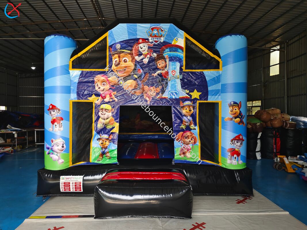 Professionele opblaasbare springkasteel met Paw Patrol thema in zwarte en blauwe kleuren, speciaal ontworpen voor commercieel gebruik en kinderentertainment.