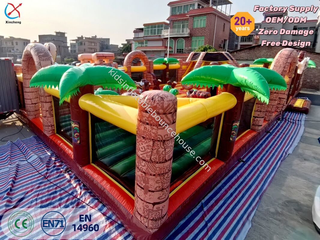 Dit spannende opblaasbare springkasteel met tropisch thema is voorzien van levendige graphics en een ruime glijbaan, wat zorgt voor een meeslepende speelervaring voor kinderen. De robuuste constructie garandeert veilig spring- en glijplezier op feesten en evenementen.